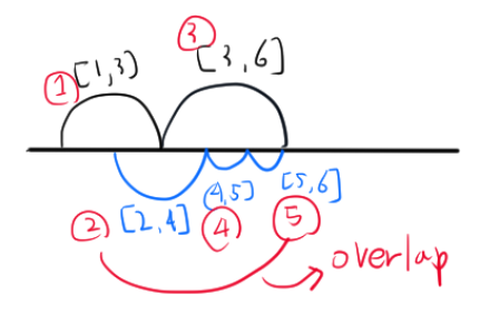 처음에는 문제를 잘못 이해해여, [1,3] [2,4]와 같이 겹치더라도 합해져 더 큰 구간을 만드므로 둘은 overlapping되지 않는 거라고 생각했다.