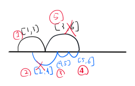 구간 [1,3] [2,4] [3,6] [4,5] [5,6]을 start를 기준으로 오름차순 정렬했다고 생각해보자.