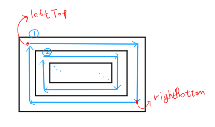 이제 왼쪽 위(left top)와 오른쪽 아래(right bottom)점을 기준으로 외각을 한 바퀴 순회한 순서를 구하는 함수 호출하여 leftTop과 rightBottom을 대각선으로 좁혀주면 모든 칸을 순회할 수 있다.
