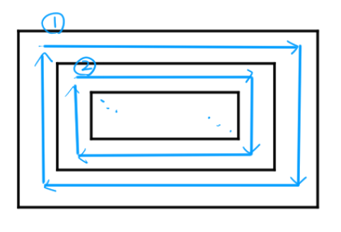 행렬을 나선형 순서로 돌아가기 위해서는 결국에는 외각을 한 바퀴 돌고 한 칸 안쪽에서 다시 한 바퀴 도는 것을 반복하게 된다.