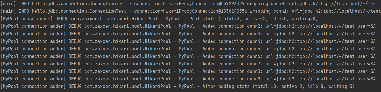 아래의 로그를 확인해 보면 10개의 커넥션이 생성되고 2개는 활성화, 나머지 8개는 대기 상태임을 확인할 수 있다.