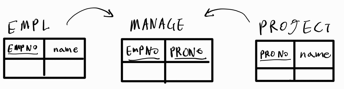 사원과 프로젝트의 관계인 MANAGE라는 참조 테이블이 독립적으로 생성된다.