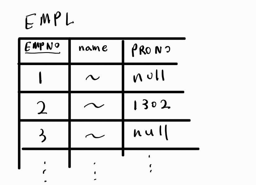 그러므로, A(0,1) - (1,1)B의 관계에서는 완전 참여하는 테이블(프로젝트)이 부분 참여하는 테이블(사원)의 기본키를 외래키로 가져가는 것이 효율적이다.