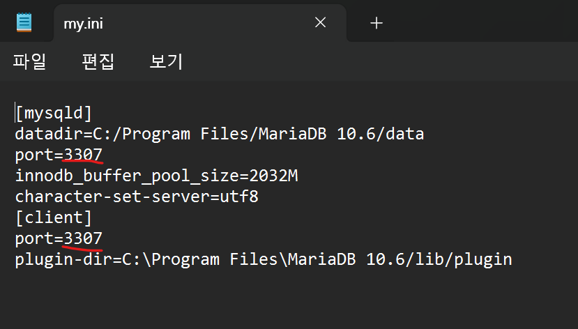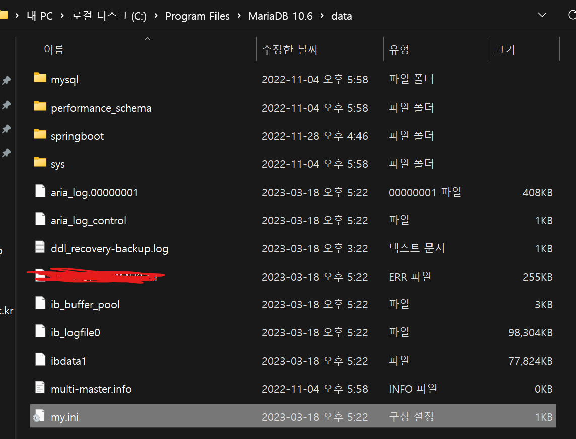 mariaDB의 폴더에 접근해서 my.ini을 열어주자.