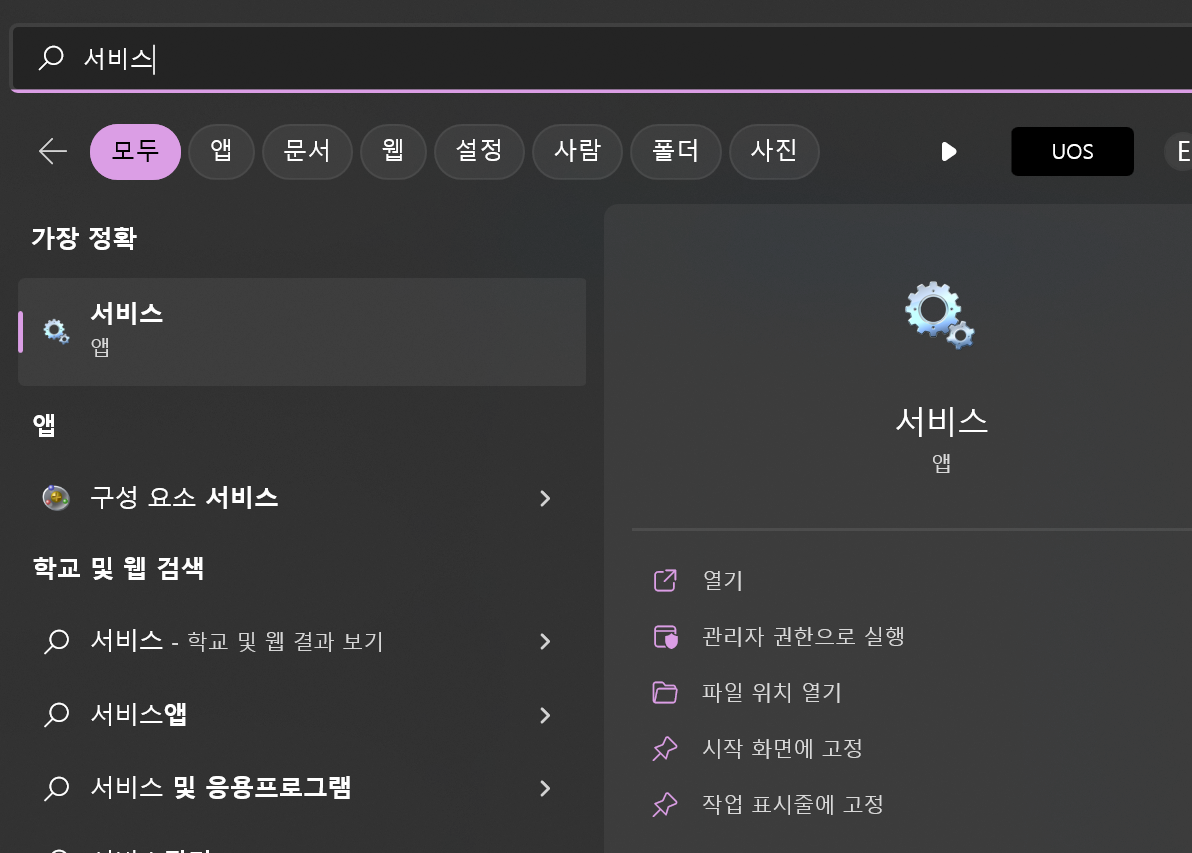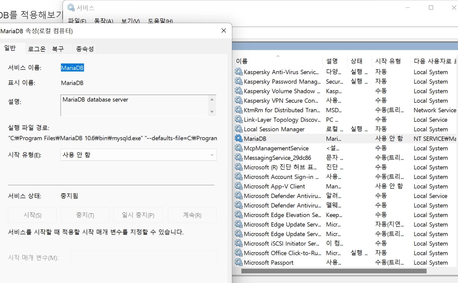 서비스 앱을 통해서 MariaDB의 시작 유형을 '사용 안 함'으로 만들어 주자.
