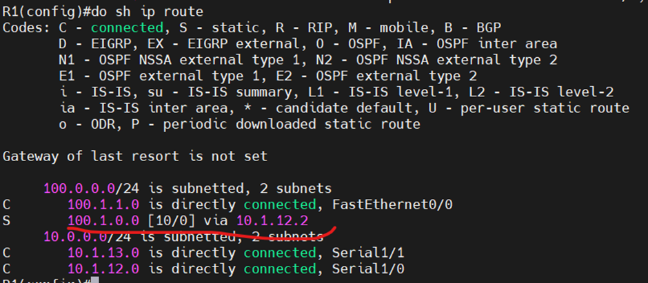 ip route 100.1.0.0 255.255.255.0 10.1.12.2 10 #R2로 바로