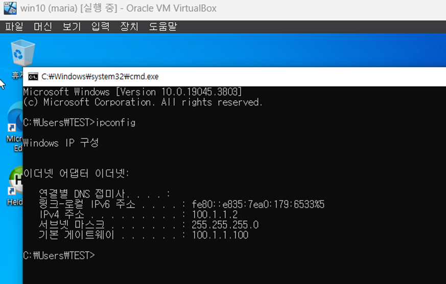 세팅 후, 같은 회선으로 연결된 window 10에 ipconfig/renew로 ip를 받아오자.