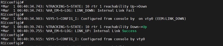 만약 R1 자신의 인터페이스에 장애 발생 시, SLA로 Health check(빨라도 1초)를 하지 않더라도 바로 인지할 수 있을 것이다. 따라서 Health check로 문제 발생을 파악하기보다 빠르게 EEM으로 대처할 수 있다.