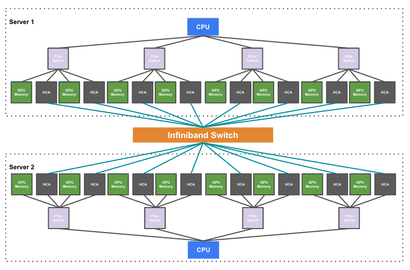 아래처럼 각 GPU마다 메모리가 존재하므로 HCA를 연결하여 GPU끼리 연결 시킬 수 있다.
