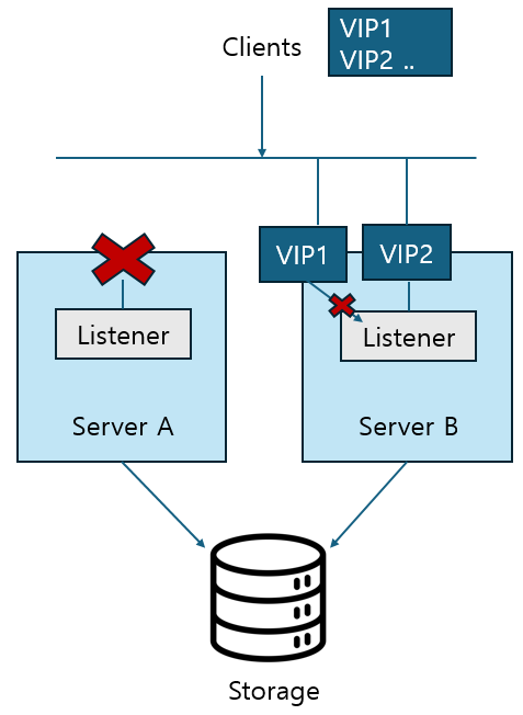 단, Oracle RAC는 Active-Standby 형식에서 하나의 VIP가 장애 발생 시 standby 서버로 옮겨지는 failover 방식이 아니다.