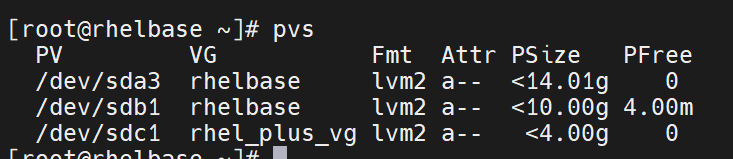 pvs로 확인해 보면 rhelbase라는 volume 그룹이 확장하려는 논리 볼륨의 대상이다.