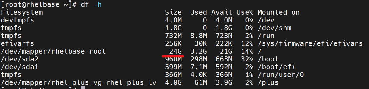 이제 / 의 크기가 20G에서 24G로 확장된 것이 확인된다.