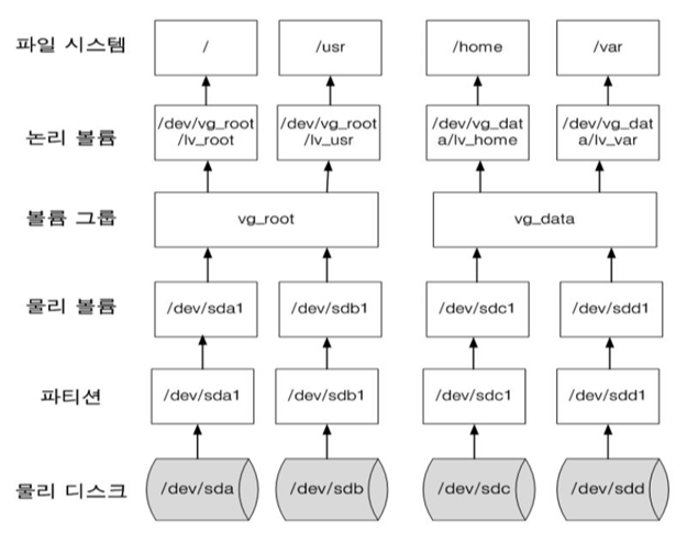 LVM(Logical Volume Manager)LVM은 물리 스토리지를 가상화하여 여러 개의 물리 디스크를 하나의 용량을 가지는 파일 시스템을 구성/관리할 수 있다.LVM을 크게 분류하면 physical Volume, Volume Group, Logical Volum
