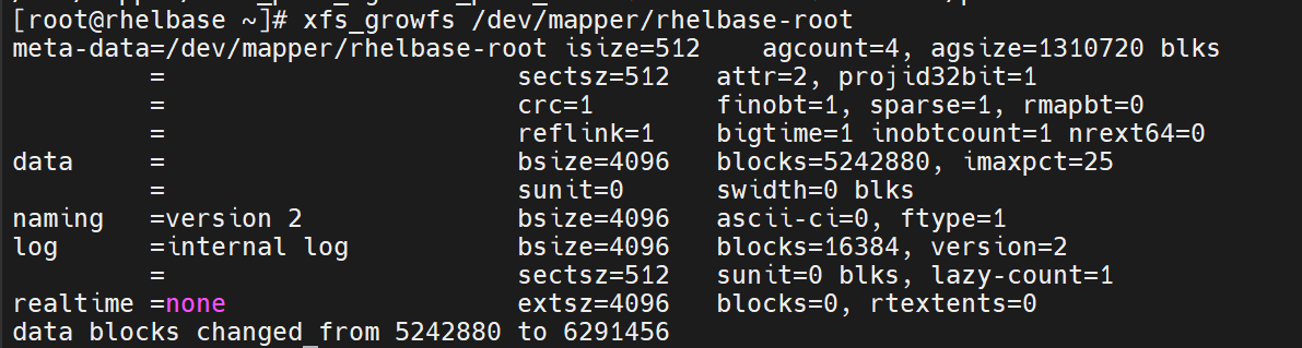 xfs_growfs /dev/mapper/rhelbase-root